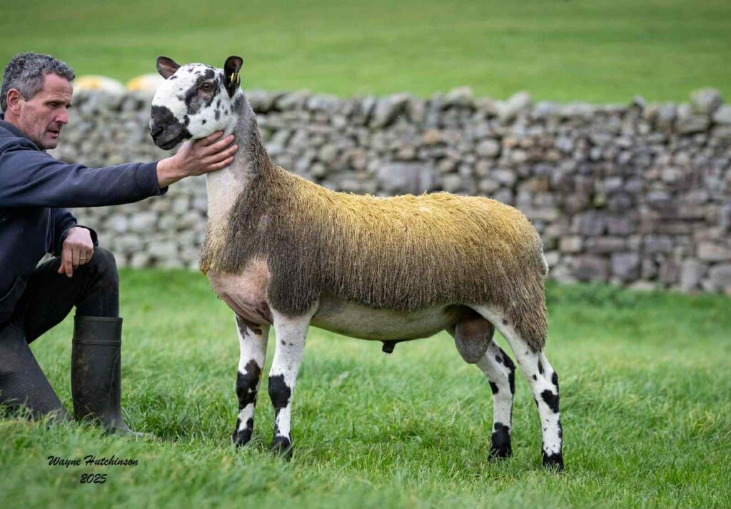Topping the trade was the 4th prize tup lamb V1 Mcffi, from Carwyn & Maria Richards, along with son Iestyn, making just their third trip to Hawes as sellers. Their 6 hour trip from the depth of Wales proved worthwhile as buyers flocked to the pen all day. This powerful lamb is no stranger to the show ring, taking first prize at the Royal Welsh Show earlier this summer. His full sister took 1st prize at the Highland Show last year as a gimmer lamb too. He was sired by the £8000 S1 Temain, bought out of Hawes a couple of years back, a son of the Beeches Wingman, and his mother is out of a ewe bought from Michael James’s Duhonw flock and by a Riddings sire, so he is full of great bloodlines on both sides. Selling the tup was the legendry figure of Raymond Lund, who didn’t miss a bid all day, especially on this one, and his hammer fell, after a bit of coaxing for that final bid or two, at £40,000, selling in a four-way split over the border into Scotland with Blarnavaid, Drumbeg Farms, Hamildean and Happrew all joining forces to land him. The fun wasn’t over just yet for the Mcffi flock as his full brother went through the ring at £7000, taking the flock average to £23,500, giving the family a dream of a day.