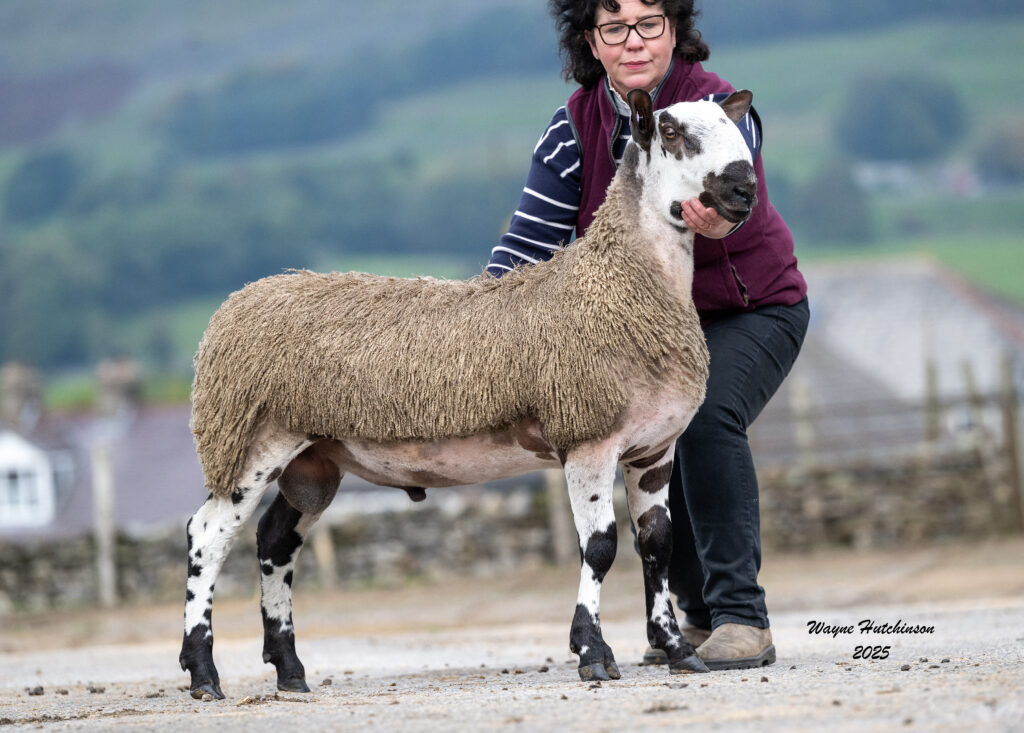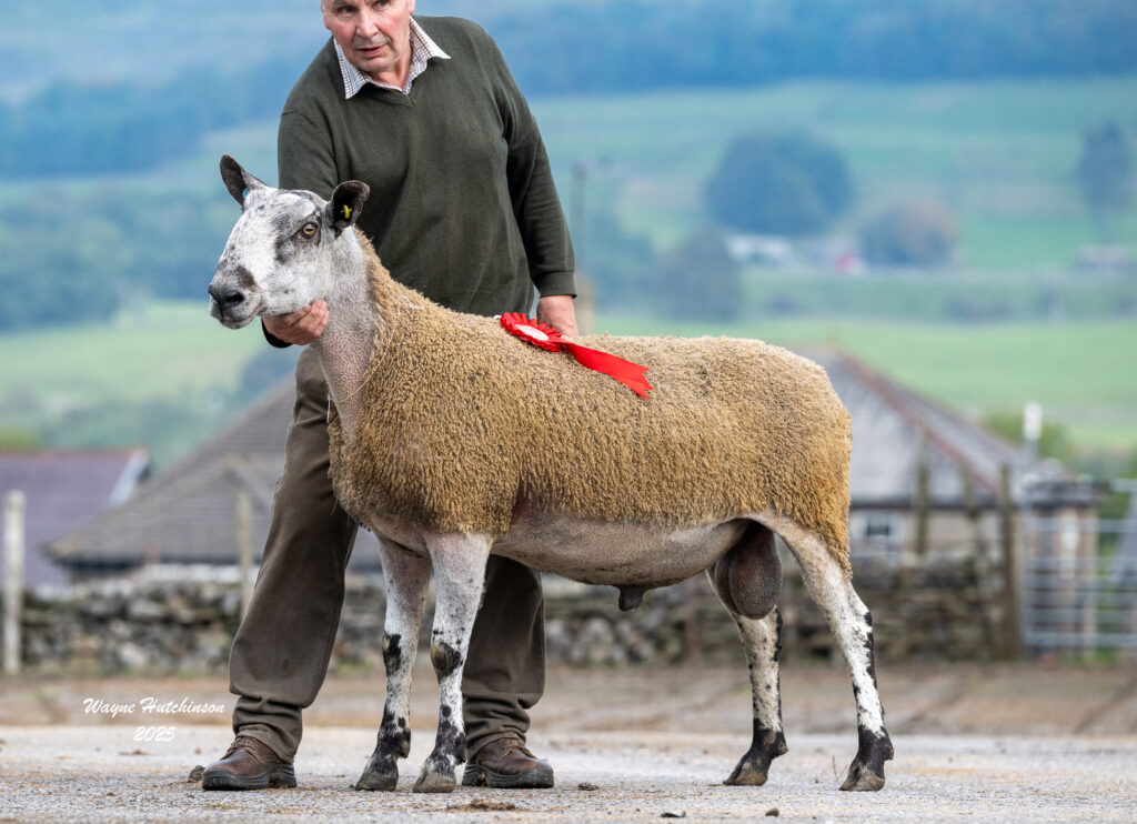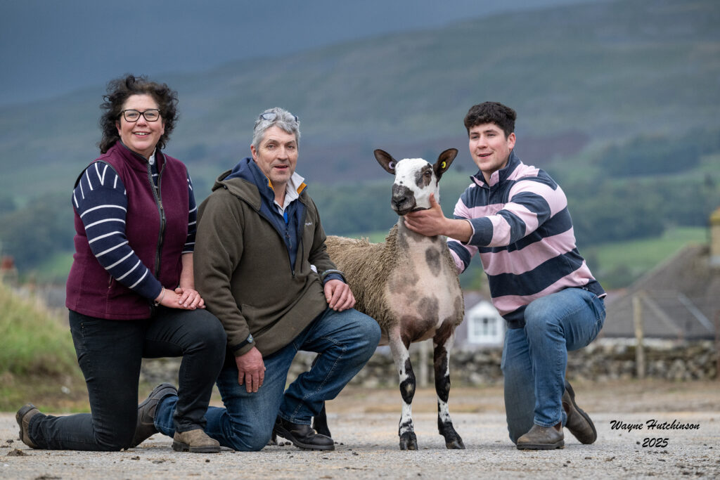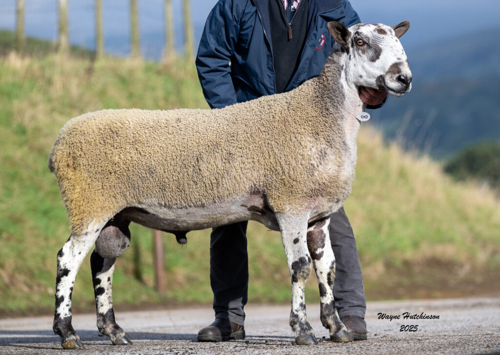 Topping the trade was the 4th prize tup lamb V1 Mcffi, from Carwyn & Maria Richards, along with son Iestyn, making just their third trip to Hawes as sellers. Their 6 hour trip from the depth of Wales proved worthwhile as buyers flocked to the pen all day. This powerful lamb is no stranger to the show ring, taking first prize at the Royal Welsh Show earlier this summer. His full sister took 1st prize at the Highland Show last year as a gimmer lamb too. He was sired by the £8000 S1 Temain, bought out of Hawes a couple of years back, a son of the Beeches Wingman, and his mother is out of a ewe bought from Michael James’s Duhonw flock and by a Riddings sire, so he is full of great bloodlines on both sides. Selling the tup was the legendry figure of Raymond Lund, who didn’t miss a bid all day, especially on this one, and his hammer fell, after a bit of coaxing for that final bid or two, at £40,000, selling in a four-way split over the border into Scotland with Blarnavaid, Drumbeg Farms, Hamildean and Happrew all joining forces to land him. The fun wasn’t over just yet for the Mcffi flock as his full brother went through the ring at £7000, taking the flock average to £23,500, giving the family a dream of a day.