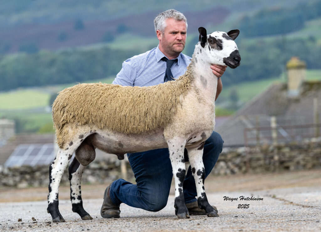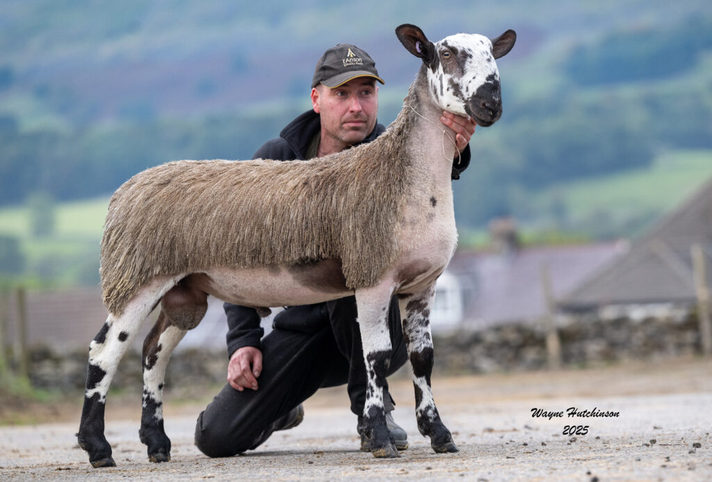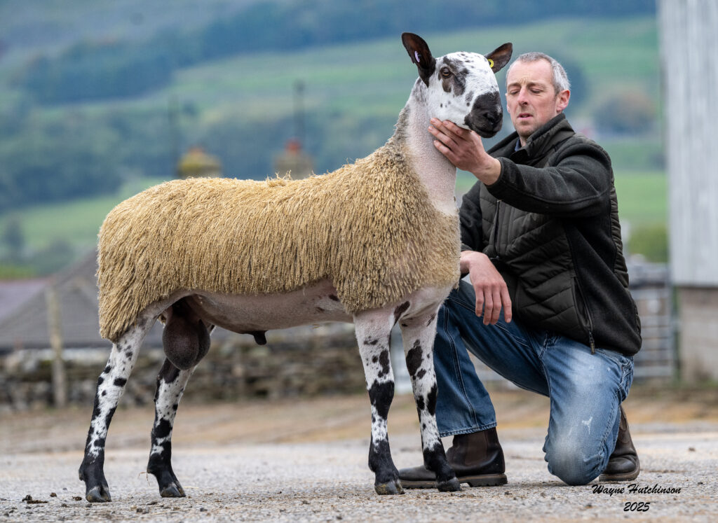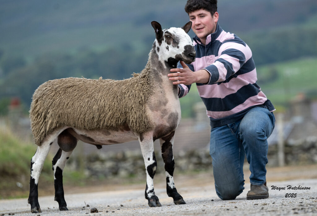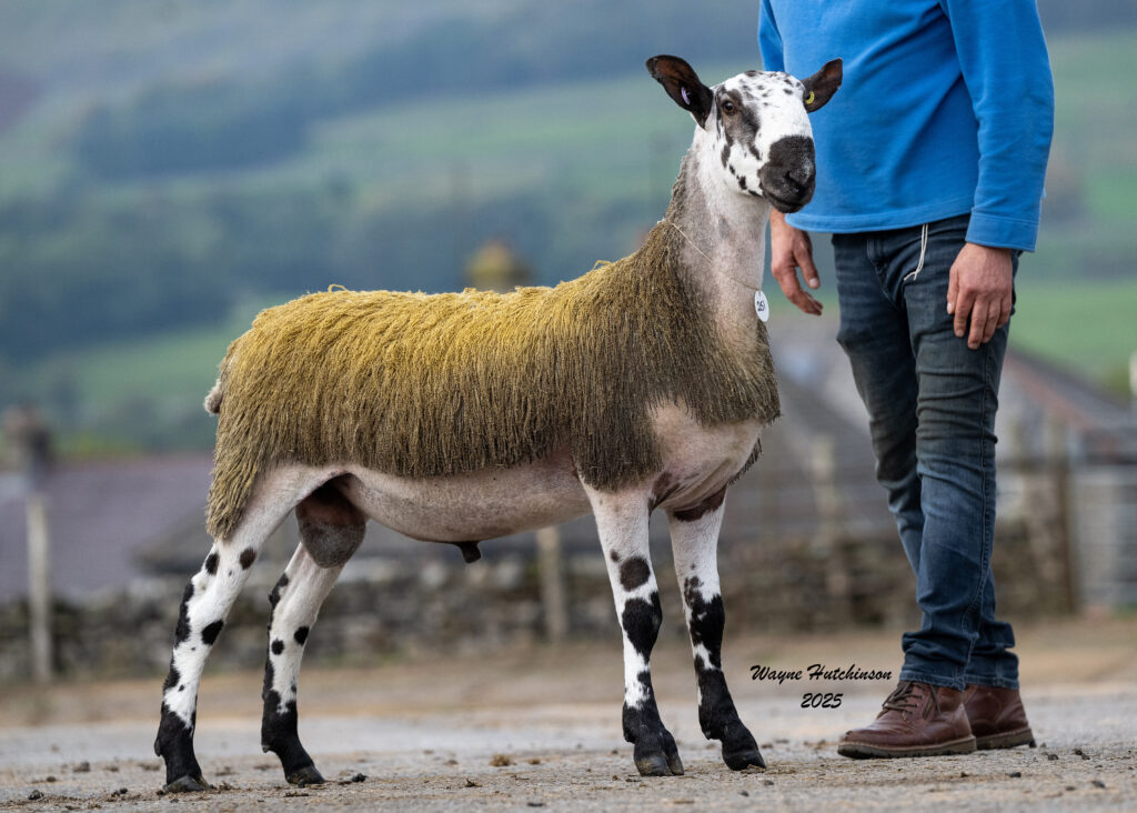 Topping the trade was the 4th prize tup lamb V1 Mcffi, from Carwyn & Maria Richards, along with son Iestyn, making just their third trip to Hawes as sellers. Their 6 hour trip from the depth of Wales proved worthwhile as buyers flocked to the pen all day. This powerful lamb is no stranger to the show ring, taking first prize at the Royal Welsh Show earlier this summer. His full sister took 1st prize at the Highland Show last year as a gimmer lamb too. He was sired by the £8000 S1 Temain, bought out of Hawes a couple of years back, a son of the Beeches Wingman, and his mother is out of a ewe bought from Michael James’s Duhonw flock and by a Riddings sire, so he is full of great bloodlines on both sides. Selling the tup was the legendry figure of Raymond Lund, who didn’t miss a bid all day, especially on this one, and his hammer fell, after a bit of coaxing for that final bid or two, at £40,000, selling in a four-way split over the border into Scotland with Blarnavaid, Drumbeg Farms, Hamildean and Happrew all joining forces to land him. The fun wasn’t over just yet for the Mcffi flock as his full brother went through the ring at £7000, taking the flock average to £23,500, giving the family a dream of a day.